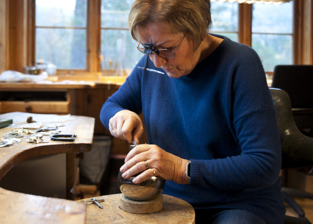 – Da jeg kom til Setesdal, ble jeg den tredje som tok svennebrev. Før det hadde folk fått løyve til å drive med sølv uten å ha papirene i orden. Det var eneste måten å opprettholde behovet for bunadssølv. Så skjedde det en endring. Det gikk sport i å få mesterbrevet. Og det var utrolig viktig for faget, forteller Kirsten Marie Bråten Berg som har et yrkesliv som har vært fordelt mellom sang og sølv. Hun etablerte eget verksted i 1977 og er autodidakt gravør, noe som etter hvert ble hennes hovedfelt. I verkstedet graverte hun spenner og søljer, og hørte på gamle kvede-opptak. Nå lever folkemusikkdronningen og ridder av 1. klasse av St. Olavs orden et travelt pensjonistliv.